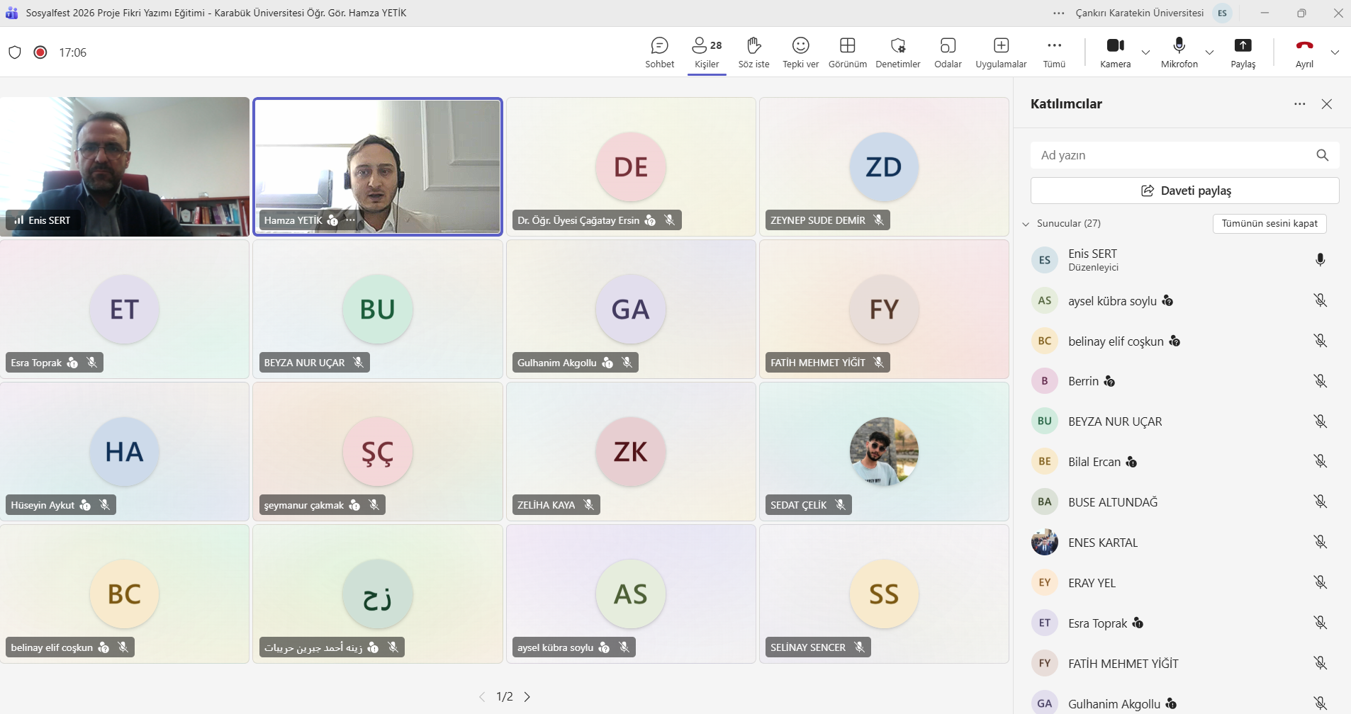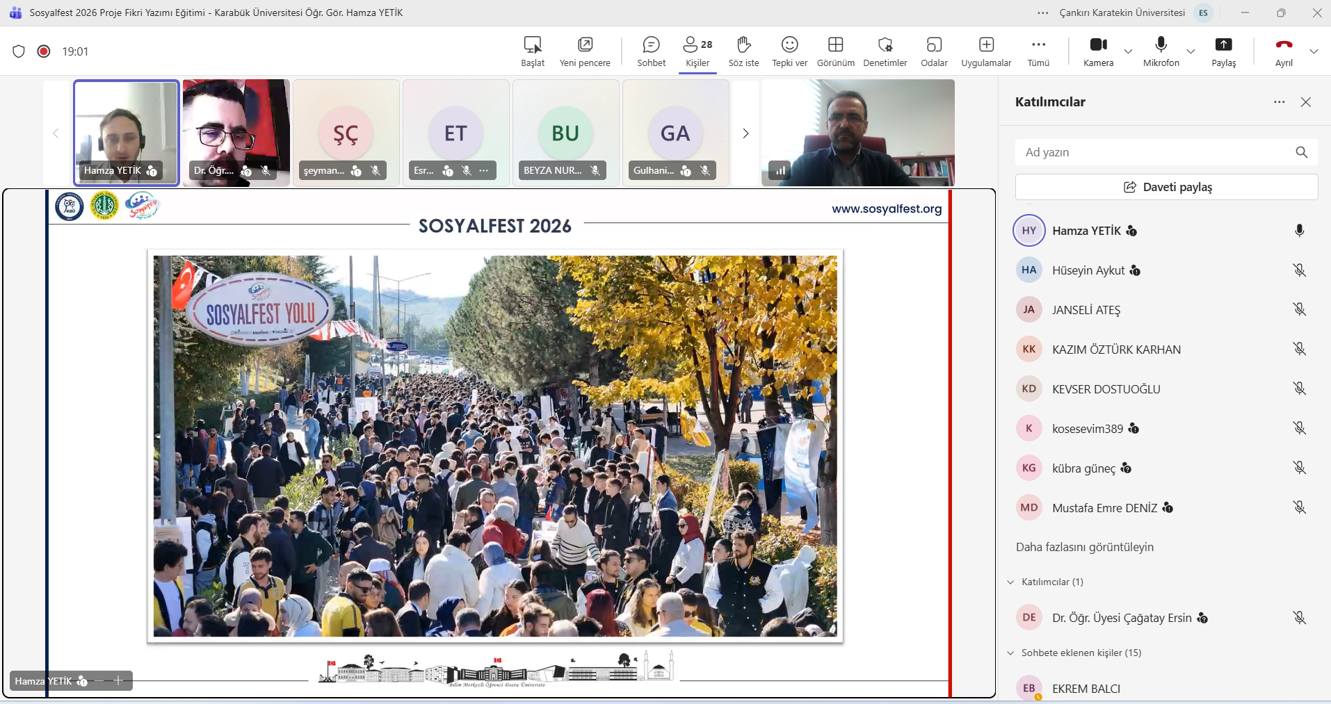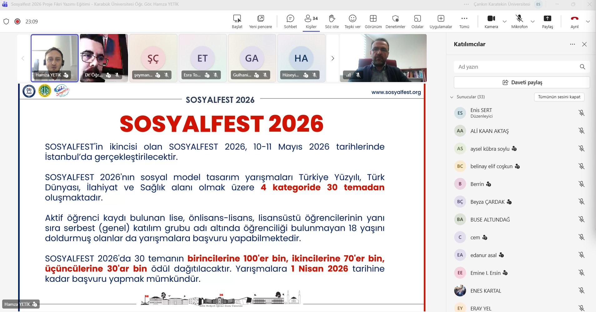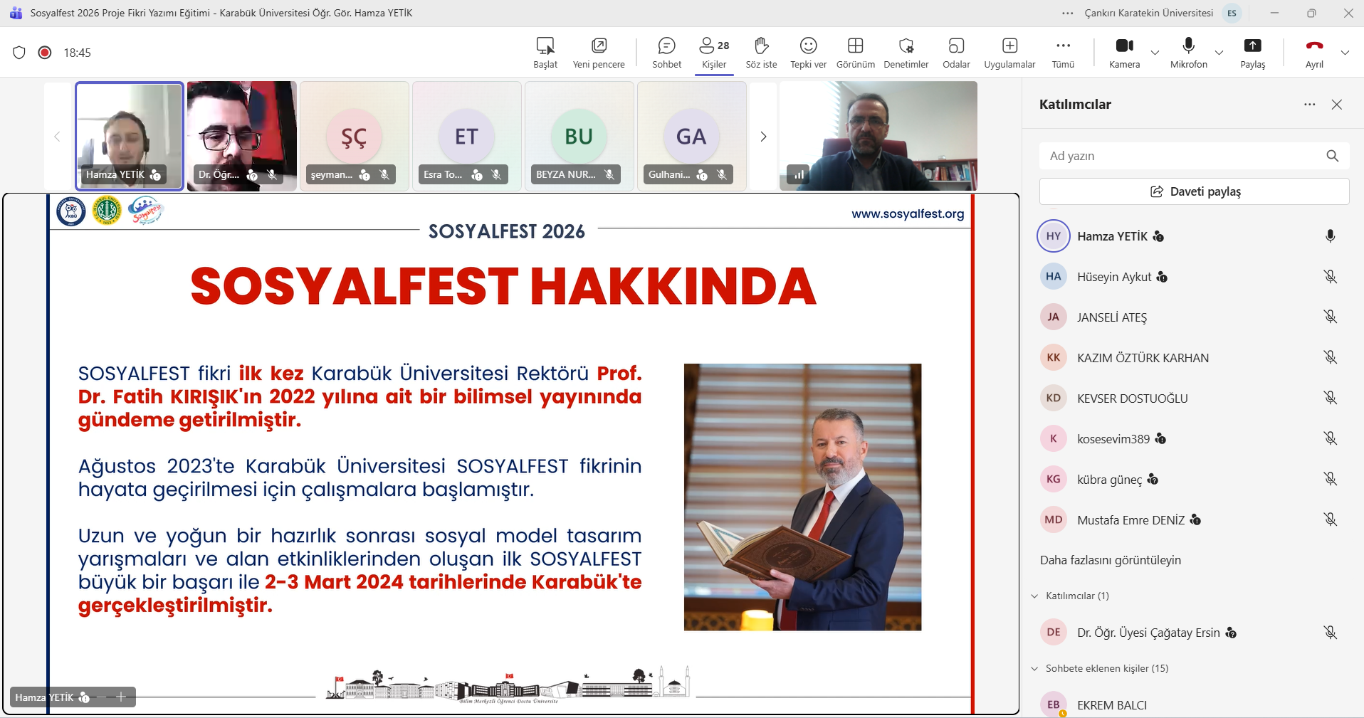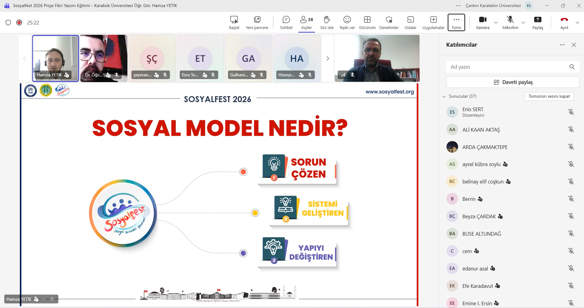 Çankırı Karatekin Üniversitesi TEKNOFEST ve Yarışmalar Koordinatörlüğü tarafından düzenlenen “SosyalFest 2026 Proje Hazırlama Eğitimi”, 25 Mart 2026 tarihinde çevrim içi olarak gerçekleştirildi.